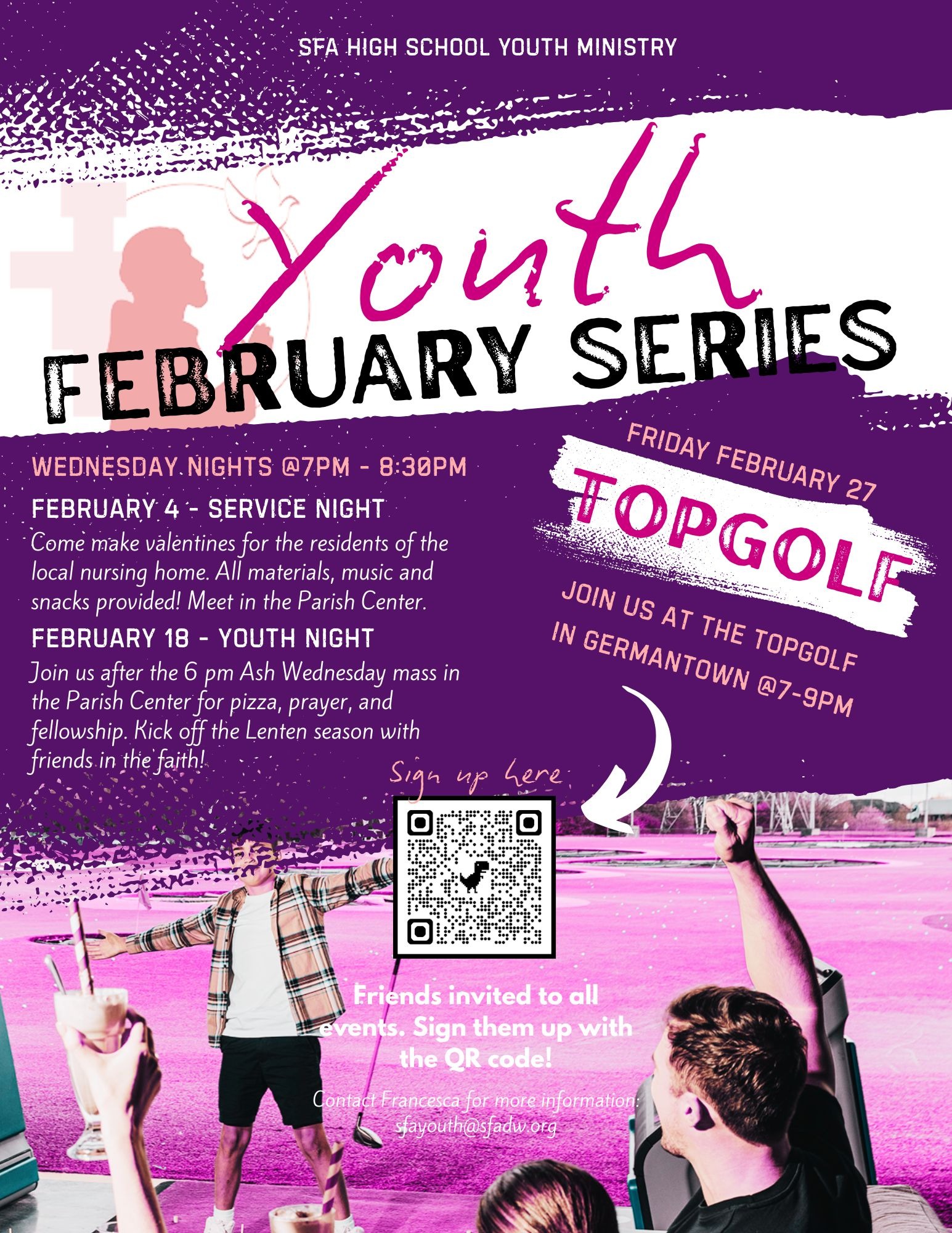 Our mission is to invite teens to deepen their relationship with Christ through prayer, formation, service and positive relationships. We walk with teens and provide them with opportunities to build lasting friendships with one another and the wider parish community. We guide them in discovering how they can change the world through the gift of their lives, and we challenge them to live out their faith each and every day. | Sun | Mon | Tue | Wed | Thu | Fri | Sat |